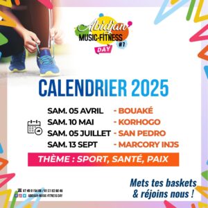 L’édition 2025 d’Abidjan Music-Fitness Day promet encore plus d’énergie et de convivialité. Voici les dates à ne pas manquer : Samedi 5 avril à Bouaké, 10 mai à Korhogo, 5 juillet à San Pedro et le