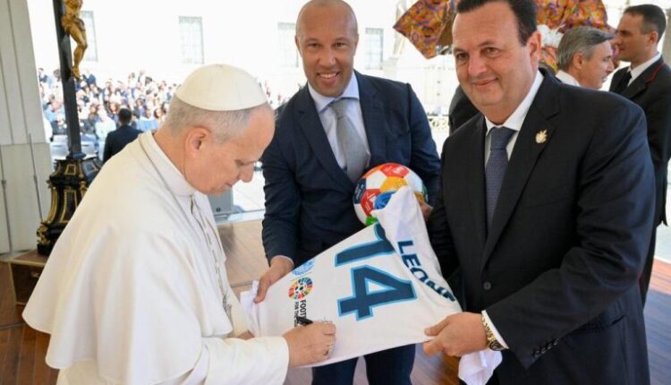 L’ancien international français Mikaël Silvestre remet un maillot et un ballon de football dédicacés au Pape Léon XIV, au Vatican, afin de promouvoir l’initiative des Nations Unies « Le Football pour les Objectifs », aux côtés de l’entrepreneur Paolo Celi