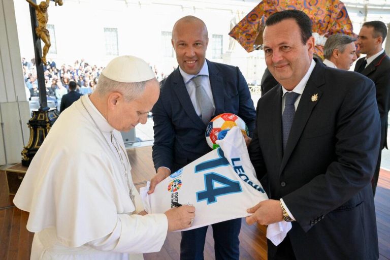 Au cours de cette rencontre, plusieurs objets symboliques ont été remis au Pape, dont un maillot blanc floqué « Leone 14 », un ballon aux couleurs des 17 ODD ainsi qu’une écharpe aux couleurs de l’initiative. Le souverain pontife a, en retour, apposé sa signature sur le maillot, destiné à être exposé au siège des Nations Unies à New York.