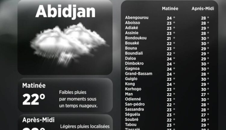 La température la plus élevée cet après-midi est de 30 degrés. Ce temps est observé dans les villes de Bondoukou, Bouaké, Dimbokro, Gagnoa, Guiglo, Odienné, Yamoussoukro et Korhogo.