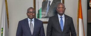 S.E.M. Ibrahima Touré, et le ministre ivoirien des Sports, Metch Adjé Silas, à Abidjan